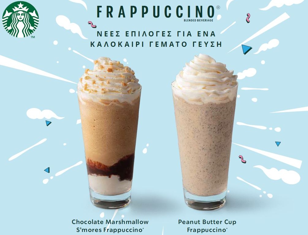 Φέτος, η οικογένεια των Frappuccino® blended ροφημάτων εμπλουτίστηκε με δύο νέα μέλη: Το απολαυστικό Chocolate MarshmallowS’ mores Frappuccino® και το νέο Peanut Cup Butter Frappuccino®. Τα νέα ροφήματα θα αποτελέσουν την καλύτερη επιλογή για ένα μεγάλο περίπατο στη πόλη ή για την απογεματινή σας βόλτα δίπλα στη θάλασσα! Το μόνο που χρειάζεται να κάνεις, είναι να επισκεφτείς ένα κατάστημα Starbucks από τον δικό σου barista να ετοιμάσει το αγαπημένο σου ρόφημα.