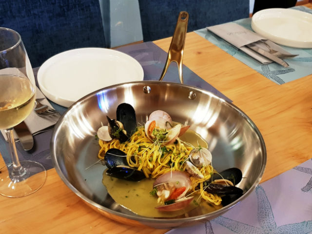 Στο μενού θα βρείτε δημιουργικά πιάτα με θαλασσινά και ψάρι μεταξύ άλλων τα γιουβαρλάκια γαρίδας με μολόχα, καυκαλίθρες και σάλτσα μοσχολέμονου, ροφό με παραδοσιακό ξινό τραχανά και πεσκανδρίτσα ποσέ με πουρέ παστινάκι/ρίζας μαϊντανού και σάλτσα αμπελόφυλλο.