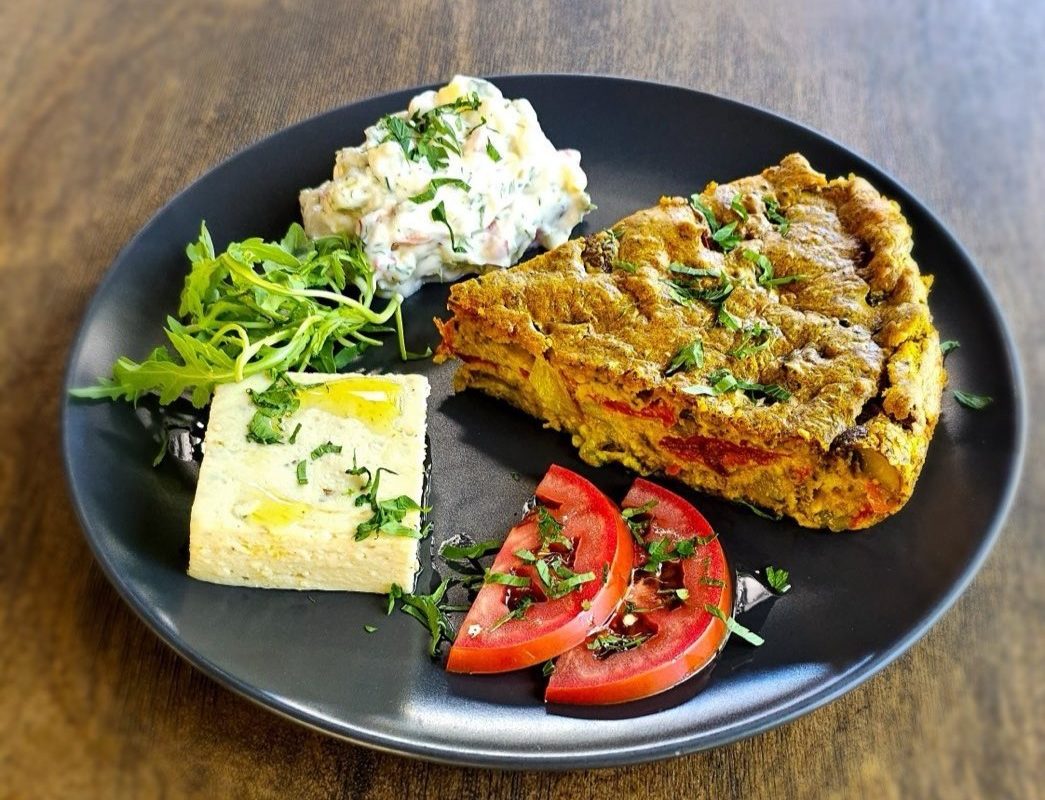 Αν πάλι θέλεις να δοκιμάσεις μια από τις σπεσιαλιτέ του καταλόγου, που βρίσκεται ανάμεσα στις επιλογές των κυρίως πιάτων -ωστόσο σερβίρεται και πρωί- οφείλεις να πάρεις την οµελέτα φούρνου. Ψήνεται στον φούρνο µε βάση ηλιόσπορους και σπόρους chia, µε µανιτάρια, πράσινες και κόκκινες πιπεριές, κρεµµύδι, φρέσκια ντοµάτα και µυρωδικά, ενώ στο πιάτο σου έρχεται συνοδευόμενη από φυτική φέτα, ρώσικη σαλάτα από λαχανικά και γάλα σόγιας, ντοµάτα και ρόκα.