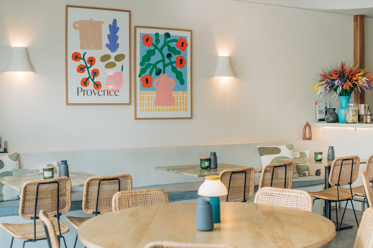 Ο χώρος είναι μίνιμαλ αλλά σίγουρα όχι αδιάφορος, το λευκό στους τοίχους κάνει τον χώρο απίστευτα φωτεινό, ενώ το ξύλο σε καρέκλες και τραπέζια και οι χρωματικές πινελιές στις διακοσμητικές λεπτομέρειες το κάνουν ιδιαίτερα cozy. Μπαίνοντας στο εσωτερικό του η μεγάλη, κάπως οβάλ, λευκή μπάρα με το τιρκουάζ βάζο και τα χρωματιστά λουλούδια είναι λες και σου χαμογελάει.