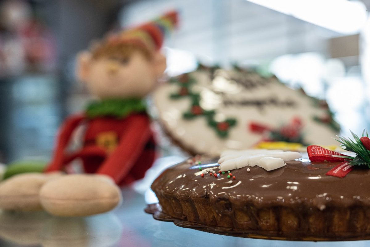 Το πρόβλημα ξεκινάει όμως ακριβώς τη στιγμή που θα περάσεις την πόρτα του καταστήματος και θα σταθείς μπροστά από αυτές τις βιτρίνες. Γιατί παραδίπλα θα δεις να απλώνεται όλη η γευστική μαγεία των Χριστουγέννων: Μελομακάρονα, κουραμπιέδες, σοκολατένιοι κορμοί (όπως αυτός με το κάστανο, που είναι ό,τι πρέπει για το γιορτινό τραπέζι), λαχταριστά κέικ (με πρωταγωνιστή το πληθωρικό red velvet), μπισκότα βουτύρου πασπαλισμένα με ζάχαρη άχνη ή με ζαχαρόπαστα, μπισκοτόδεντρα και μπισκοτόσπιτα που ενθουσιάζουν τα παιδιά είναι μερικές μόνο από τις επιλογές. Χωρίς να ξεχνάμε βέβαια τη βασιλόπιτα, η οποία ετοιμάζεται σε δύο εκδοχές: κέικ και τσουρέκι (που είναι το άλλο best seller του μαγαζιού).