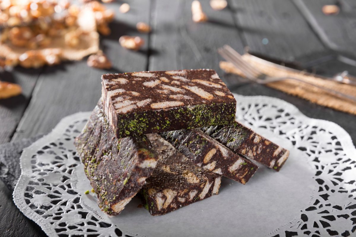 Στη συνέχεια, προσθέτουμε το αλεσμένο μπισκότο και το αναμιγνύουμε με τα χέρια. Στο τέλος, προσθέτουμε τα χοντροκομμένα μπισκότα και καρύδια.