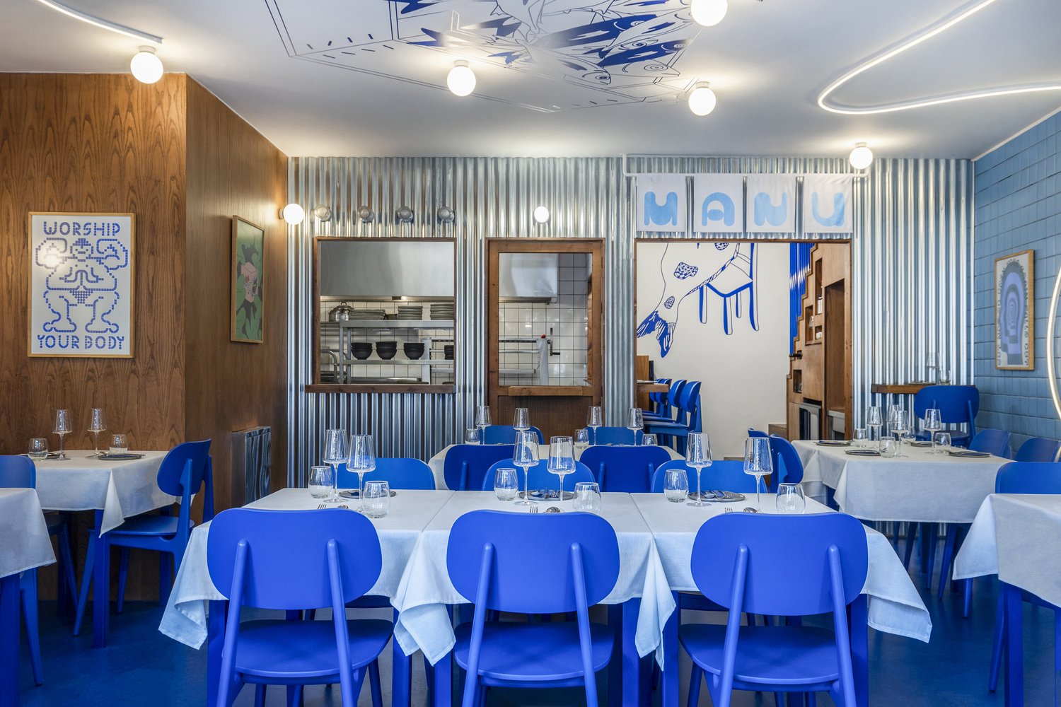 Σύγχρονο design, minimal αλλά ταυτόχρονα πληθωρικό σε άσπρες και έντονες μπλε αποχρώσεις. Θυμίζει ένα funky καφενείο, απλό, αλλά με στένσιλ και ασιατικές επιρροές. Σήμα κατατεθέν του μια ανοιχτή κονσέρβα με σαρδέλες (ειρωνικό αφού στο Manu θα βρεις καθημερινά ολόφρεσκο ψάρι).