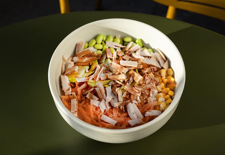 Ο σεφ σκέφτηκε το Poke Bowl με τον δικό του τρόπο. Κράτησε το ελαφρώς γλυκό και «sticky» sushi rice, τα τρυφερά και χορταστικά edamame beans με την ιδιαίτερη γεύση, προσέθεσε φρέσκο τριμμένο καρότο και γλυκό καλαμπόκι και, για να γίνει το salad bowl ένα πραγματικά ολοκληρωμένο γεύμα, διάλεξε ως πηγή πρωτεΐνης παστράμι γαλοπούλα.