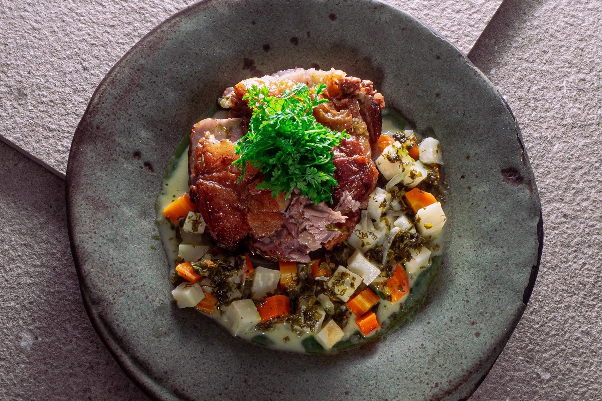 Στο εορταστικό μενού βρίσκεις παντζάρι ψητό στην παραστιά, με κατσικίσιο τυρί, μιζούνα, μαύρα μούρα και κακάο criollo και σούπα λαχανικών με καπνιστό βούτυρο και σκορδόψωμο. Για κυρίως σερβίρουν πανσέτα ψητή με κρούστα από φυστίκι Αιγίνης, λαχανικά και πουρέ καρότο με σάλτσα πετιμέζι, ενώ για επιδόρπιο μπορείς να δοκιμάσεις μελομακάρονο με cremeux σοκολάτας, σπασμένη μαρέγκα και passion fruit.