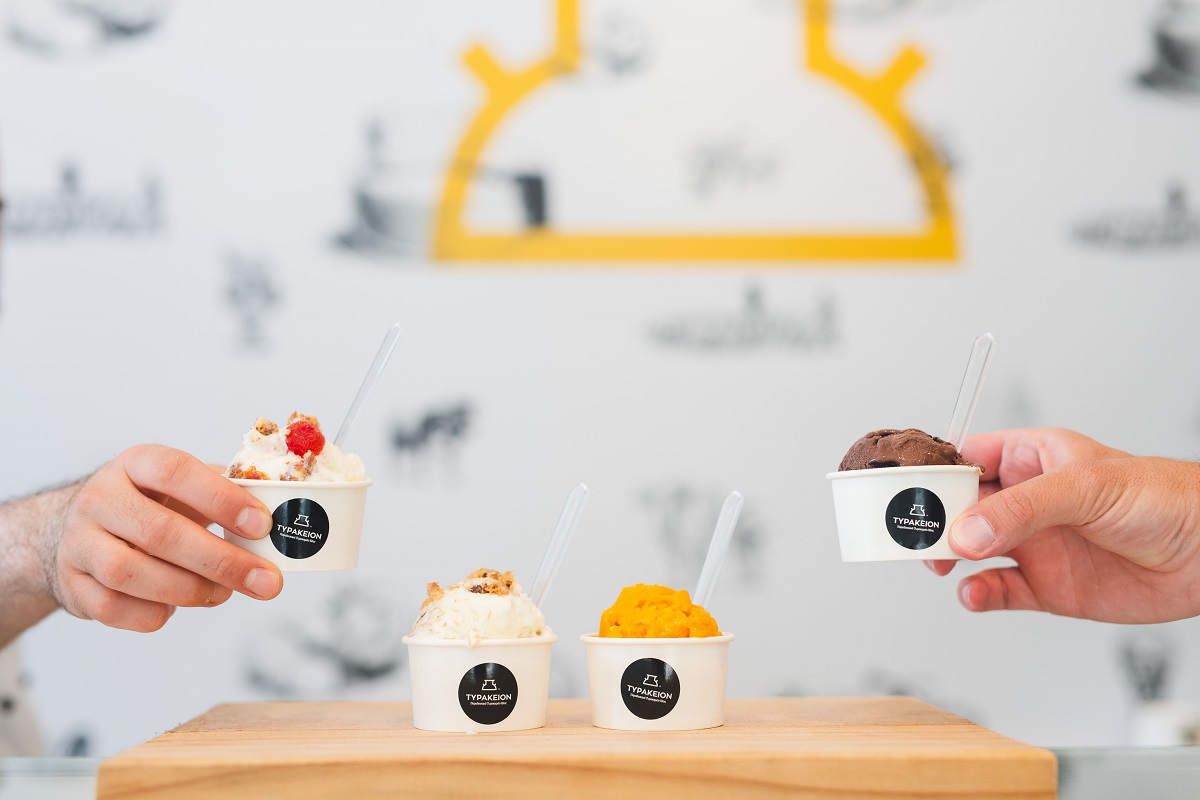 Όταν βρίσκεσαι σε ένα γαλακτοπωλείο που είναι γνωστό ότι έχει πολύ καλό γιαούρτι, δεν μπορείς να μην δοκιμάσεις και το αντίστοιχο παγωτό. Στο Τυράκειον λοιπόν, το παγωτό γιαούρτι γίνεται με το δικό τους κατσικίσιο γάλα και θυμαρίσιο μέλι από το νησί και σε κερδίζει με την γεμάτη γεύση του. Εξίσου δυνατό και το παγωτό ρυζόγαλο, ενώ για εσένα που ο καφές είναι η μεγάλη σου αγάπη, τσέκαρε τη γεύση εσπρέσο.