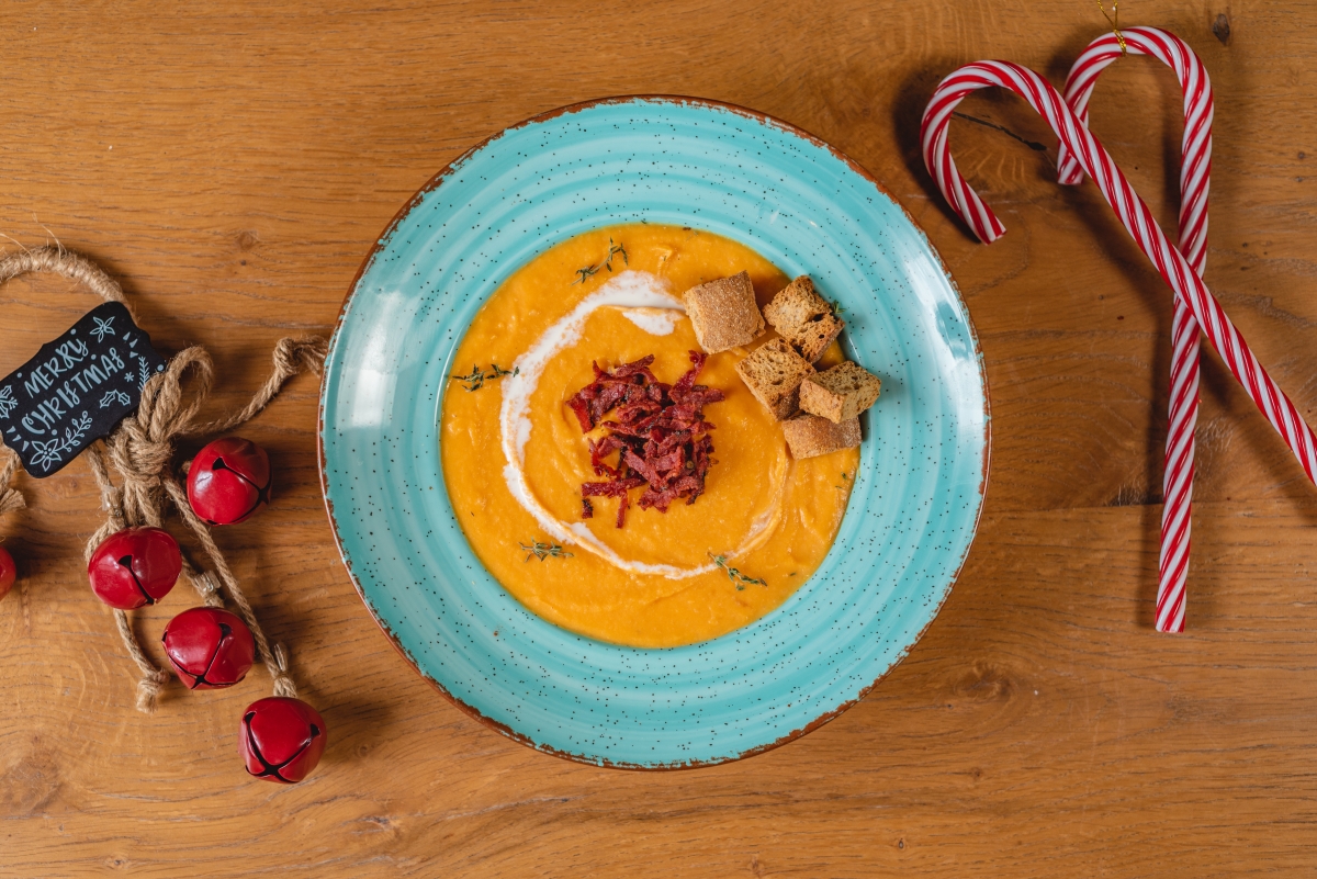 Σούπα γλυκοπατάτας βελουτέ με crispy παστράμι από τον Θανάση Καραΐνδρο
