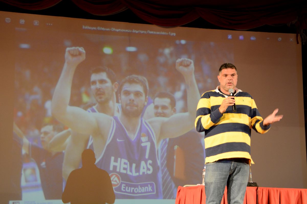 Ας μην ξεχνάμε όμως και τον αθλητισμό, που ήταν τεράστιο κομμάτι της ζωής του. Είναι ο μοναδικός Έλληνας μπασκετμπολίστας που έχει κερδίσει δύο φορές το triple crown (Ευρωλίγκα, πρωτάθλημα και κύπελλο) και έχει στο ενεργητικό του αμέτρητες διακρίσεις. «Σας απαρίθμησα τις χρονιές που πέτυχα, αλλά μέσα στα 20 χρόνια υπήρχαν και ήττες. Η διαφορά μεταξύ του νικητή και του ηττημένου είναι ότι ο πρώτος προσπάθησε μία ακόμη φορά». Η συμβουλή που έδωσε στα παιδιά είναι να ακολουθούν τη φλόγα που έχουν μέσα τους, αλλά να μην βασιστούν μόνο στον αθλητισμό. «Πιο εύκολα θα ισορροπείτε πάνω σε ένα βιβλίο, παρά σε μία μπάλα». Αναφέρθηκε στα δύσκολα παιδικά του χρόνια και στο ότι κανείς δεν πρέπει να κρίνεται από τα ρούχα που φορά ή την οικονομική του άνεση, αλλά από τη συμπεριφορά του απέναντι στους άλλους.