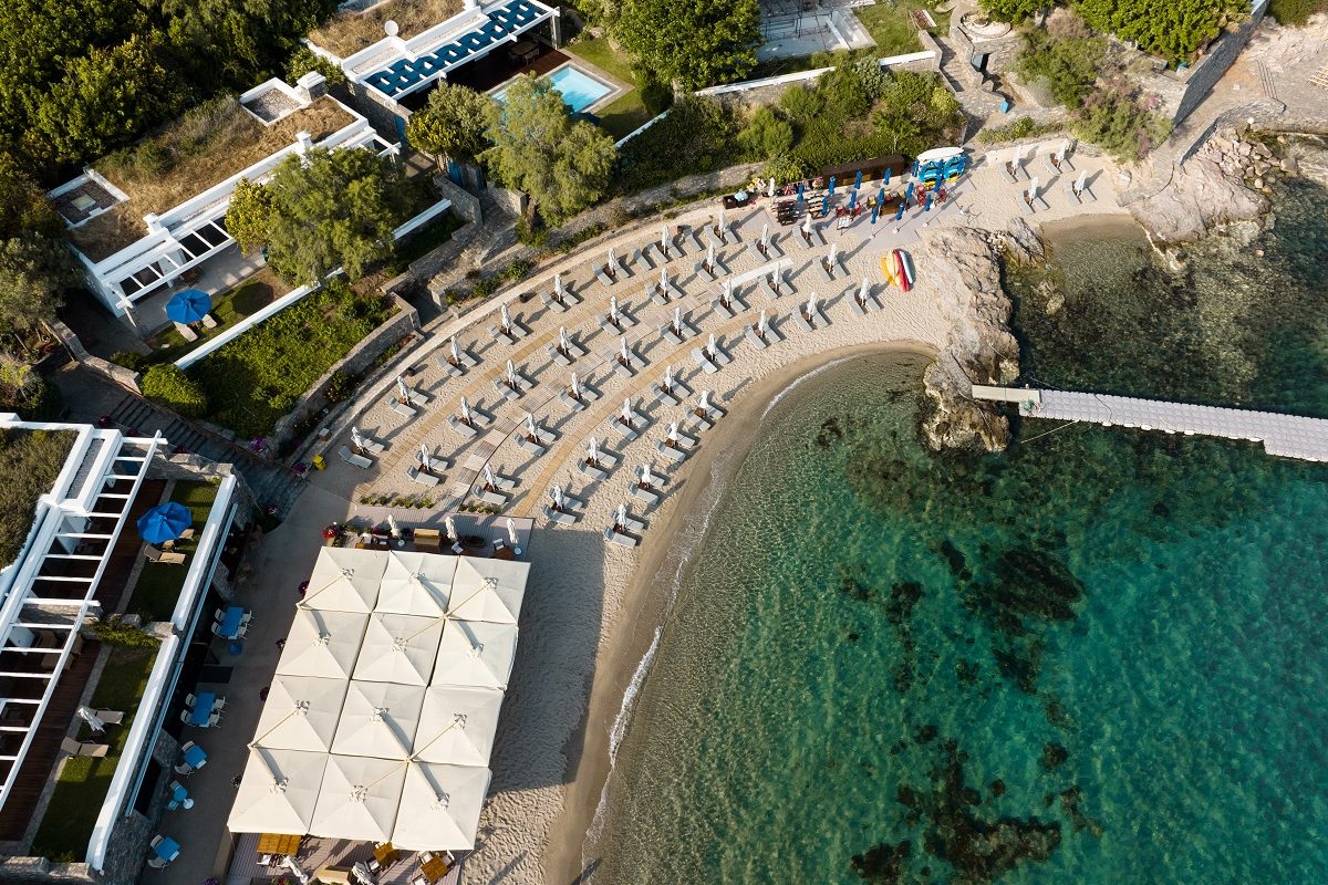Με φόντο το Αιγαίο, το αγαπημένο πεντάστερο resort, χτισμένο πάνω σε μια ιδιωτική χερσόνησο και σε ένα κατάφυτο περιβάλλον, «παντρεύει» το τοπίο απίστευτης φυσικής ομορφιάς και το εκθαμβωτικό γαλάζιο της θάλασσας με τη γαλήνη, τη διακριτική πολυτέλεια και τη φιλοξενία αξιώσεων.