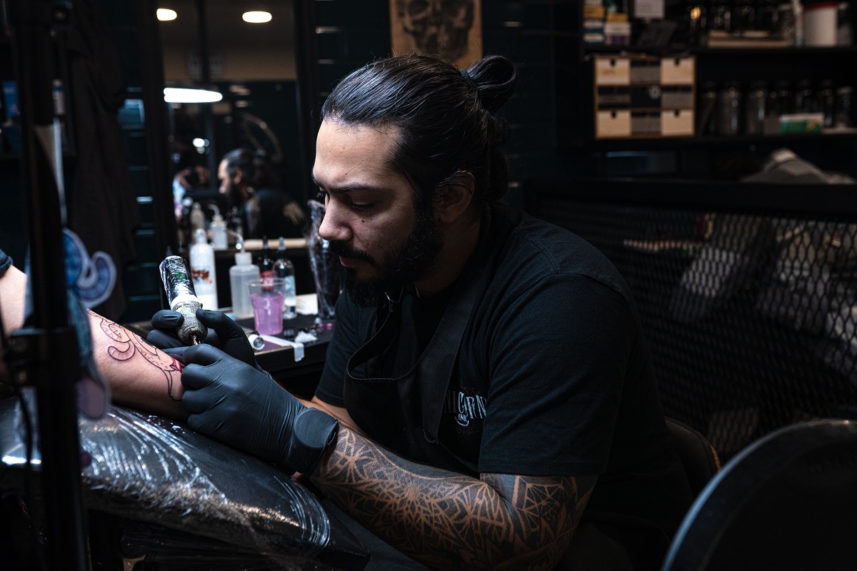 Ήμασταν τυχεροί γιατί είχαμε ένα tattoo artist από το εξωτερικό και ήξερε ήδη την τέχνη και μας βοήθησε. Έμεινε στην Ελλάδα για δουλειά και παράλληλα, φέραμε και μία κοπέλα για piercing. Στην πορεία προστέθηκαν και άλλα άτομα στην ομάδα. Ήταν παιδιά που έπιανε το χέρι τους όπως συνηθίζουμε να λέμε, ζωγράφιζαν και ουσιαστικά μετέφεραν όλα αυτά χρησιμοποιώντας το μηχανάκι του τατουάζ.