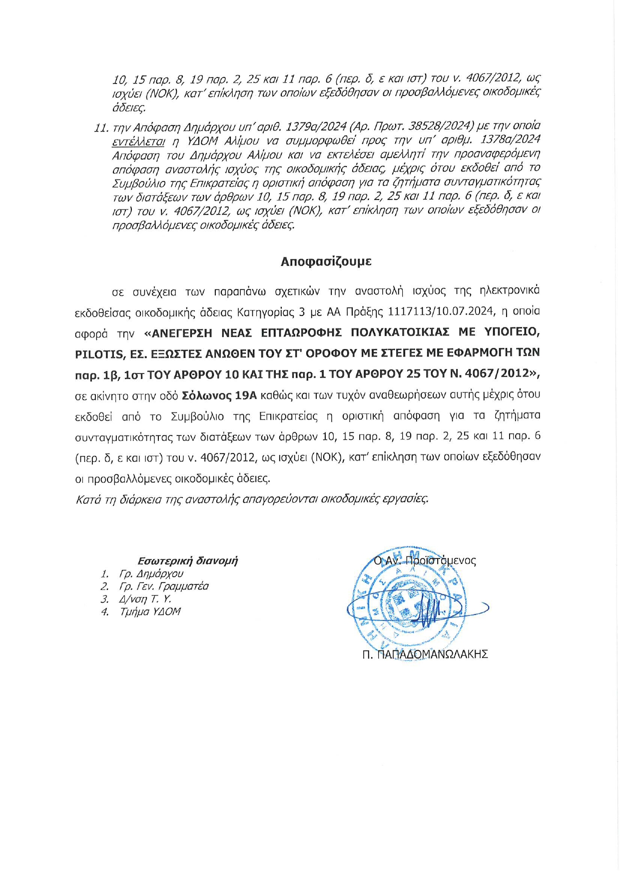 Στην προσωρινή αναστολή 43 οικοδομικών αδειών εντός των ορίων του προχώρησε στις 19 Δεκεμβρίου ο δήμος Αλίμου, αποστέλλοντας emails σε όλες τις κατασκευαστικές εταιρείες που έχουν διασφαλίσει τις άδειες αυτές και γίνεται αξιοποίηση των επίμαχων διατάξεων του Νέου Οικοδομικού Κανονισμού (ΝΟΚ) για τα ψηλά κτίρια. Οι ενημερώσεις προσωρινής αναστολής εστάλησαν από την Διεύθυνση Τεχνικών Υπηρεσιών – Τμήμα ΥΔΟΜ του δήμου Αλίμου, λίγες ώρες πριν από την ψήφιση της τροπολογίας του υπουργείου Περιβάλλοντος, η οποία συμπεριλήφθη στο νομοσχέδιο του υπουργείο Υποδομών και Μεταφορών με τίτλο: “Αναδιάρθρωση σιδηροδρομικού τομέα και ενίσχυση ρυθμιστικών φορέων μεταφορών και άλλες διατάξεις. Μία από αυτές τις αποφάσεις αναστολής που εστάλη προς την εταιρεία Αγγελόπουλος – Σαραντής, βρίσκεται στη διάθεσή μας και την παραθέτουμε ενδεικτικά στη συνέχεια.