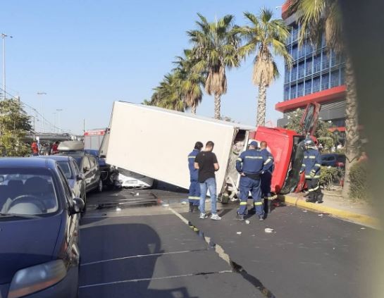 Τροχαίο με ένα φορτηγό να αναποδογυρίζει και να πέφτει πάνω σε ΙΧ στην παλιά παραλιακή στο Φάληρο, έξω από το νοσοκομείο Metropolitan - Μετ' εμποδίων η κίνηση των αυτοκινήτων στο σημείο