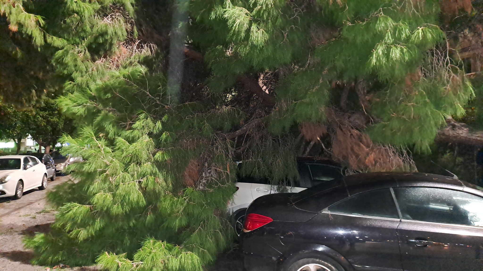 Το βράδυ της Πέμπτης, 26/12 ένα τεράστιο πεύκο κατέρρευσε καταπλακώνοντας σταθμευμένα αυτοκίνητα - Καταγελλίες των κατοίκων για την κατάσταση που ήταν το δέντρο και το πεζοδρόμιο