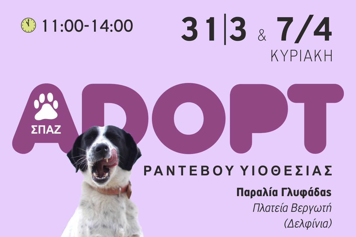 Για δύο Κυριακές ακόμη (31/3 & 7/4), ο ΣΠΑΖ διοργανώνει τα καθιερωμένα πλέον ραντεβού υιοθεσίας σκύλου στην πλατεία Βεργωτή στην παραλία της Γλυφάδας.