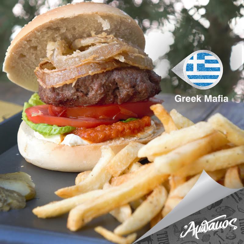 Με mousse φέτας, sauce ντομάτας, μαρούλι , onion rings & αγγουράκι τουρσί. Συνοδεύεται από φρεσκοκομμένες τηγανιτές πατάτες, ενώ το burger bun (ψωμάκι) ζυμώνεται αποκλειστικά για τον Abakos και ψήνεται στον ξυλόφουρνό μας.