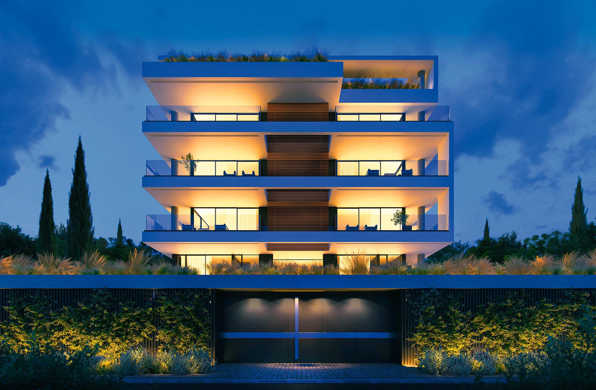 -τέσσερα διαμερίσματα (από 126τ.μ. μέχρι 194 τ.μ. έκαστο) με τρία υπνοδωμάτια και μεγάλα περιμετρικά μπαλκόνια