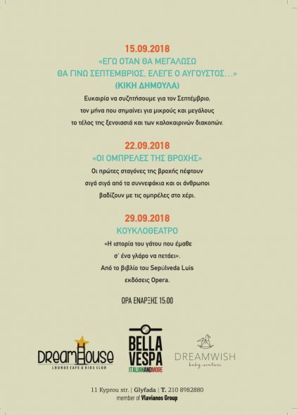 Τα μεσημέρια του Σαββάτου του Σεπτεμβρίου αποκτούν άλλη διάσταση καθώς το Bella Vespa, σε συνεργασία με το DreamHouse της Ν. Σμύρνης, παρουσιάζει διαδραστικές παραστάσεις για τους μικρούς του φίλους.