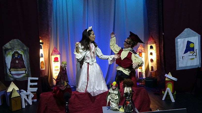Κούκλες, μάσκες, μαριονέτες, επιστρατεύονται. Δράκοι κωμικοί και γκαφατζήδες κάνουν τα παιδιά να ξεκαρδίζονται στα γέλια Κόσμοι θαυμαστοί φανερώνονται μπροστά με ήρωες γενναίους και παραμυθένιους. Ένα βασίλειο κοιμισμένο… και τρεις βασιλοπούλες με αντικείμενα μαγικά!