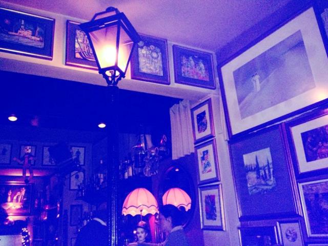 Καλά τώρα που είπαμε για τοίχους, πω πω, δεν υπάρχει αυτό που είδαν τα ματάκια μου, γεμάτοι από κάδρα, Νταλί, έργα ενός φίλου τους εικαστικού, αλλά και χαρακτικά, φωτογραφίες της Σίρλει Μπάσεϊ, του Χάμφρεϊ του Μπόγκαρτ (λέγε με Καζαμπλάνκα), του Τσάρλι Τσάπλιν (κατά κόσμον Σαρλό), τα περισσότερα δώρα από θαμώνες, Έλληνες, Αμερικάνους, Ελβετούς, Γάλλους. Αλλά το καλύτερο από όλα είναι ένας εξαιρετικός πίνακας πάνω από το μπαρ, που απεικονίζει τους δύο συνεργάτες σε νεαρότερη ηλικία. Εκεί από κάτω είδα και το τηλέφωνό τους, από αυτά τα τέλεια τα vintage ναι, πιο vintage δεν έχεις. «Και πολλά από τα αντικείμενα που έχουμε μας τα έχουν κάνει δώρο, κάποια άλλα τα έχω αγοράσει από το Μοναστηράκι». Βλέπω παλιά παιχνίδια και μουσικά όργανα κρεμασμένα από το ταβάνι. Και παλιά φανάρια δρόμου που χρησιμεύουν για σταντ. Βλέπω παντού κάτι. Παντού.