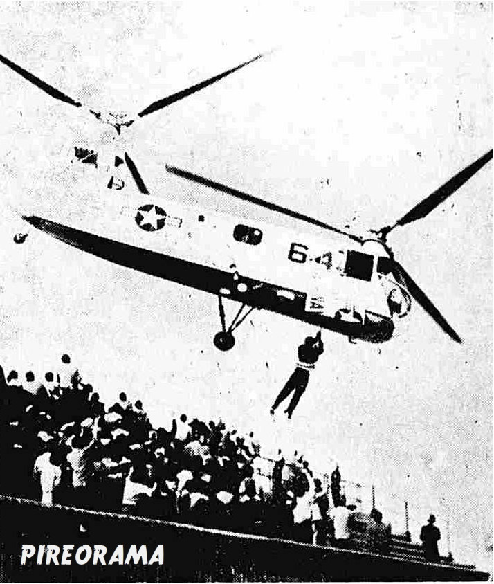 Στις 7 Απριλίου του 1957 και ημέρα Κυριακή ένα ελικόπτερο του αεροπλανοφόρου Lake Champlain (το οποίο αποτελούσε μονάδα του 6ου Αμερικανικού Στόλου) προσγειώθηκε και εκτέλεσε επίδειξη έργου διασώσεως κατά το ημίχρονο του ποδοσφαιρικού αγώνα Ολυμπιακού – Προοδευτικής.