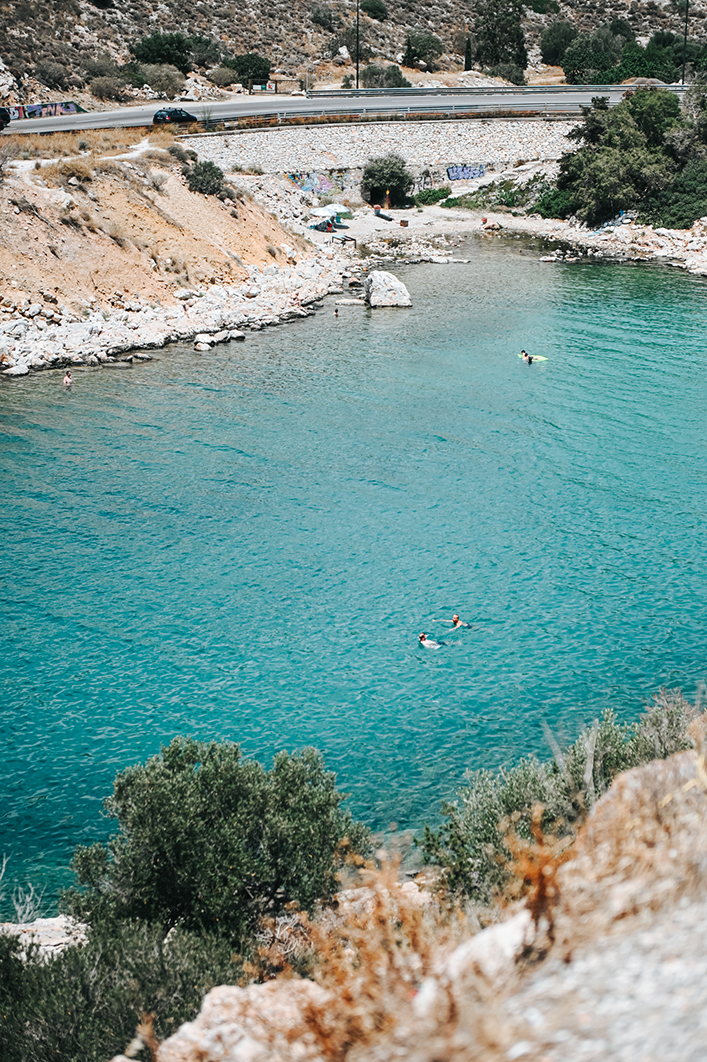 Η διαδρομή ξεκίνησε από τη Βουλιαγμένη και πρώτος σταθμός ήταν τα Λιμανάκια, αυτοί οι μικροί κολπίσκοι με τα καταγάλανα νερά και την άγρια ομορφιά, που αποτελούν μάλιστα ένα από τα πιο ξακουστά landmarks των νοτίων προαστίων, αλλά και πόλο έλξης για τους νέους που στρώνουν τις πετσέτες τους στα βράχια και απολαμβάνουν τις βουτιές τους. Στα Λιμανάκια θα βρεις και την ξακουστή καντίνα του Λευτέρη, η οποία λειτουργεί από τα 60s, για να προμηθευτείς τα απαραίτητα, οπότε το μόνο που θα σου μένει είναι να πιάσεις το ιδανικό spot. Αν τα πας καλά με τις διαδρομές στα βράχια, προσπάθησε να απομακρυνθείς από τα πλήθη, ώστε να απολαύσεις πιο απομονωμένα τη μαγεία του σημείου.