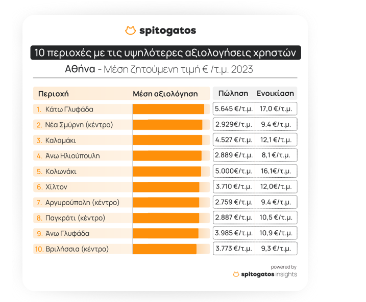 Συνολικά, οι συνοικίες της Αθήνας που αξιολογήθηκαν πιο υψηλά σε σχέση με όλα τα κριτήρια της έρευνας του Spitogatos είναι οι ακόλουθες: η Κάτω Γλυφάδα, το κέντρο της Νέας Σμύρνης, το Καλαμάκι, η Άνω Ηλιούπολη, το Κολωνάκι, η περιοχή Χιλτον, το κέντρο της Αργυρούπολης, το κέντρο του Παγκρατίου, η Άνω Γλυφάδα και το κέντρο των Βριλησσίων.