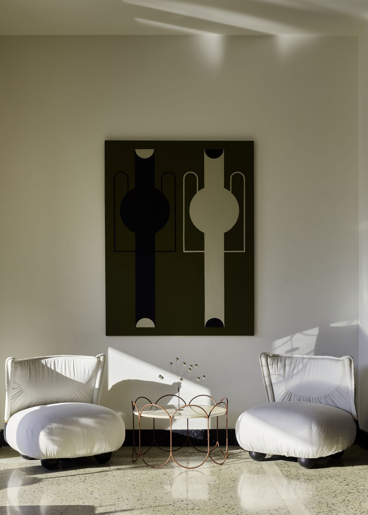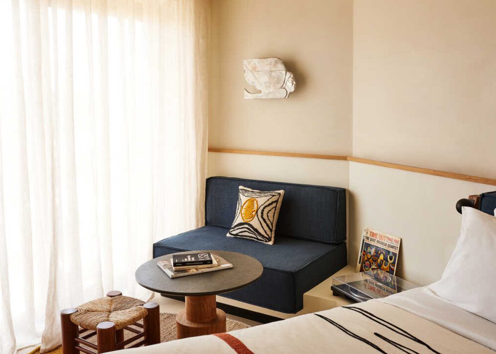 Ωστόσο αυτό που πραγματικά αποτελεί «μηχανή του χρόνου» είναι τα δωμάτια, με μια εντυπωσιακή συλλογή vintage επίπλων των δεκαετιών του 60′ και του 70′ από το Back To The Future. Διαθέτουν επίσης επιλογή βιβλίων και περιοδικών επιμελημένη από το βιβλιοπωλείο Hyper Hypo, πικάπ και συλλογή δίσκων βινυλίου με την υπογραφή του Greek Visions και διάφορες δημιουργικές συνεργασίες, που συμπεριλαμβάνουν custom ρόμπες και κουβέρτες σχεδιασμένες από τη Salma Barakat και μαξιλάρια από το Mare Studio.