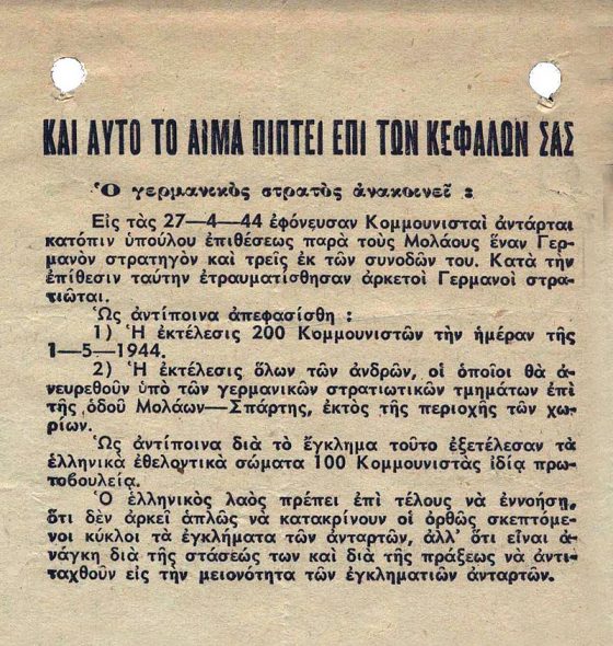 Εις τας 27-4-44 εφόνευσαν Κομμουνισταί αντάρται κατόπιν υπούλου επιθέσεως παρά τούς Μολάους έναν Γερμανόν στρατηγόν και τρεις εκ των συνοδών του. Κατά την επίθεσιν ταύτην ετραυματίσθησαν αρκετοί Γερμανοί στρατιώται.