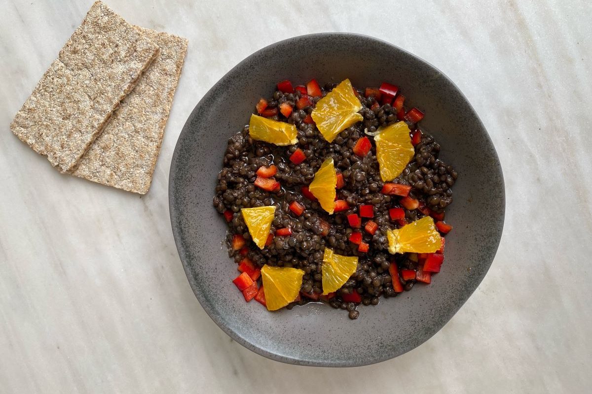 5) Σαλάτα με φακές beluga, κόκκινη πιπεριά και πορτοκάλι