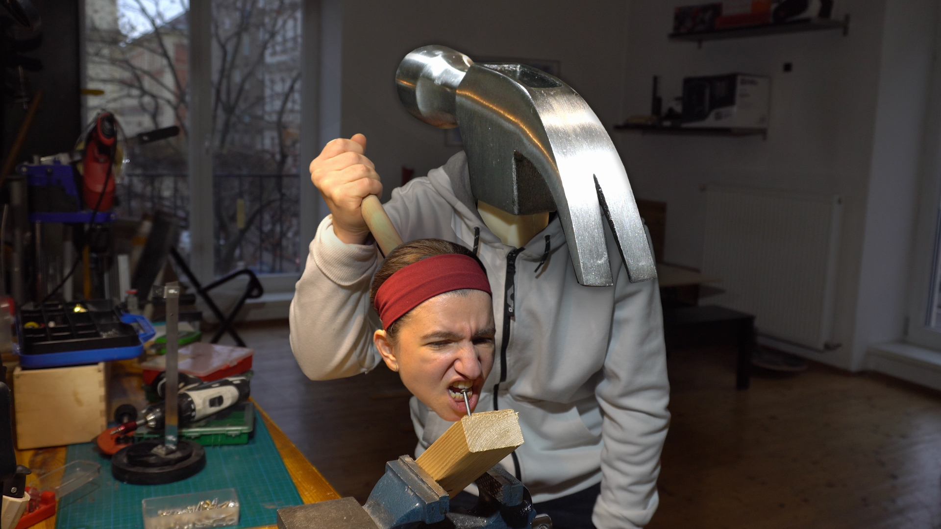Επισκέπτομαι πόλεις και χτυπάω το κεφάλι μου σε διάφορες επιφάνειες. Ένα μικρόφωνο, τοποθετημένο στο κεφάλι μου, καταγράφει τον ήχο αυτών των χτυπημάτων. Μία κάμερα, τοποθετημένη στο πλάι, καταγράφει κάθε δράση. Έτσι, όλα είναι ορατά: η δράση, ο ήχος, η επιφάνεια όπου χτυπάω το κεφάλι μου, και η υπαίθρια ατμόσφαιρα του χώρου. Το να χτυπά κανείς το κεφάλι του σε κάποιον τοίχο είναι μία καθολικά γνωστή κίνηση. Άνθρωποι σε απελπισία, που δεν ξέρουν τι άλλο να κάνουν, μπορεί να χτυπήσουν το κεφάλι τους στον τοίχο. Δεν πρόκειται πάντα για κυριολεξία. Συνήθως στέκει ως μεταφορά για εκείνες τις στιγμές που δε βρίσκεις τρόπο να διαχειριστείς ένα έντονο αίσθημα σύγχυσης. Αν όμως παρατηρήσουμε αυτήν την κίνηση ως ένα όργανο, μία ανέλπιδη πράξη μετατρέπεται σταδιακά σε μία παράλογη επανάληψη.