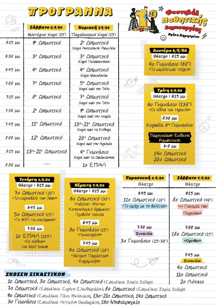 Ο Δήμος Αγίου Δημητρίου μεταμορφώνεται σε ένα ζωντανό κύτταρο πολιτισμού και νεανικής έκφρασης, καθώς όλα είναι έτοιμα για το 1ο Φεστιβάλ Μαθητικής Δημιουργίας. Από το Σάββατο 2 Μαΐου έως και το Σάββατο 9 Μαΐου 2026, το Στρογγυλό Σχολείο «Τάκης Ζενέτος» θα φιλοξενήσει το ταλέντο, τη φαντασία και το μεράκι των μαθητών και μαθητριών της πόλης.