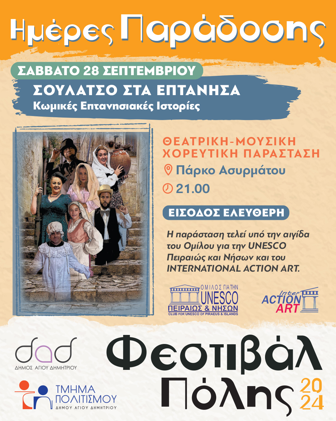 Το Σάββατο 28 Σεπτεμβρίου, στις 21:00, η θεατρική παράσταση «Σουλάτσο στα Επτάνησα» θα παρουσιάσει κωμικές επτανησιακές ιστορίες, ζωντανή μουσική και καντάδες. Η παράσταση, υπό την αιγίδα του Ομίλου για την UNESCO Πειραιώς και Νήσων και του International Action Art, θα συνοδευτεί από βράβευση της θεατρικής ομάδας Νέα Επτανησιακή Σκηνή για την προσφορά της στον ελληνικό πολιτισμό.