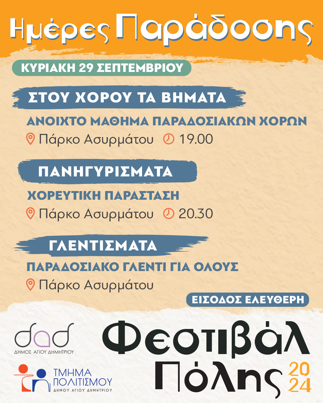 Το φετινό Φεστιβάλ Πόλης του Δήμου Αγίου Δημητρίου κλείνει τις επιτυχημένες εκδηλώσεις του με ένα διήμερο αφιερωμένο στην ελληνική μουσική και χορευτική παράδοση. Το Σαββατοκύριακο 28 και 29 Σεπτεμβρίου, το Πάρκο Ασυρμάτου θα γεμίσει ήχους και χρώματα από κάθε γωνιά της Ελλάδας, προσφέροντας στους επισκέπτες ένα ταξίδι στην πολιτιστική κληρονομιά.