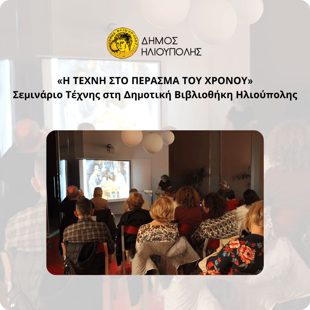 Το Τμήμα Πολιτισμού του Δήμου Ηλιούπολης, επαναλαμβάνει το επιτυχημένο σεμινάριο «Η Τέχνη στο Πέρασμα του Χρόνου», μεταφέροντας τους συμμετέχοντες από τους πρωτόγονους λαούς μέχρι τις σύγχρονες καλλιτεχνικές τάσεις.