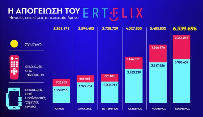 Το ERTFLIX μόνο τον Δεκέμβριο δέχθηκε περισσότερες από 6,3 εκατομμύρια επισκέψεις και αθροιστικά από τον Ιούνιο περισσότερες από 23 εκατομμύρια. Γεγονός που την αναδεικνύει πλέον στην δημοφιλέστερη εγχώρια ψηφιακή πλατφόρμα που παρέχει δωρεάν ταινίες, σειρές και γενικότερα βίντεο on demand.