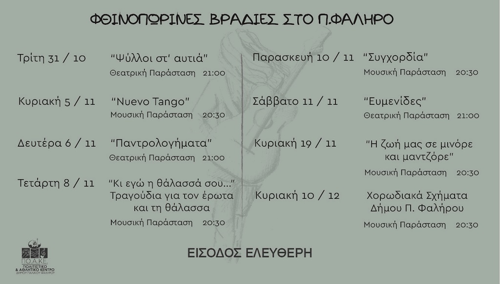 Ο κύκλος «Φθινοπωρινές Βραδιές 2023» που διοργανώνονται από τον Δήμο Π. Φαλήρου και το Πολιτιστικό Αθλητικό Κέντρο (ΠΟ.Α.ΚΕ) θα διαρκέσει μέχρι τις 10 Δεκεμβρίου 2023 και περιλαμβάνει 8 μουσικό-θεατρικές εκδηλώσεις με δωρεάν είσοδο για τους πολίτες.