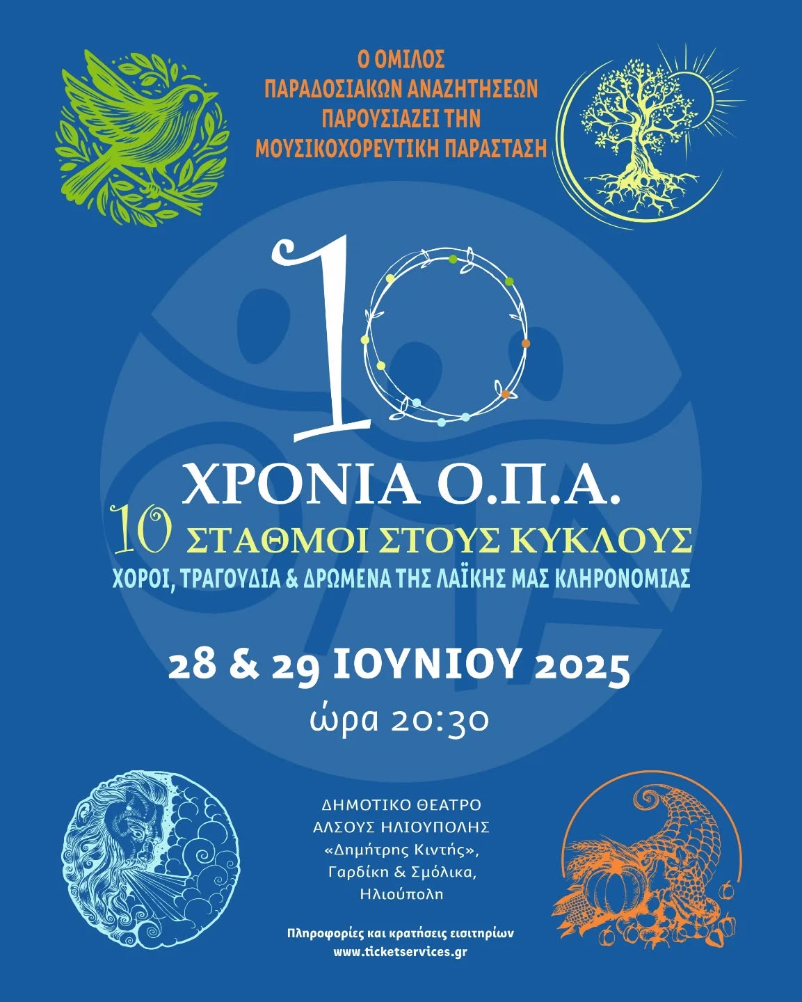 Ο Όμιλος Παραδοσιακών Αναζητήσεων (Ο.Π.Α.), με αφορμή τα 10 Χρόνια λειτουργίας και δράσης του, διοργανώνει μία διήμερη μουσικοχορευτική παράσταση με θέμα τους 10 σημαντικότερους σταθμούς στους Κύκλους της Ζωής και του Χρόνου.