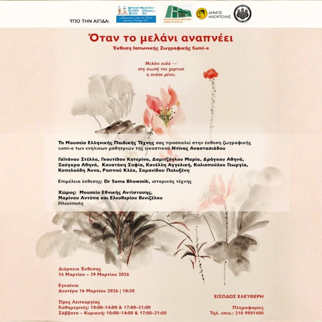 Η λιτή και βαθιά ποιητική τέχνη της ιαπωνικής ζωγραφικής sumi-e έρχεται στην Ηλιούπολη μέσα από την έκθεση «Όταν το μελάνι αναπνέει», που φιλοξενείται στο Μουσείο Εθνικής Αντίστασης από τις 16 έως τις 29 Μαρτίου.