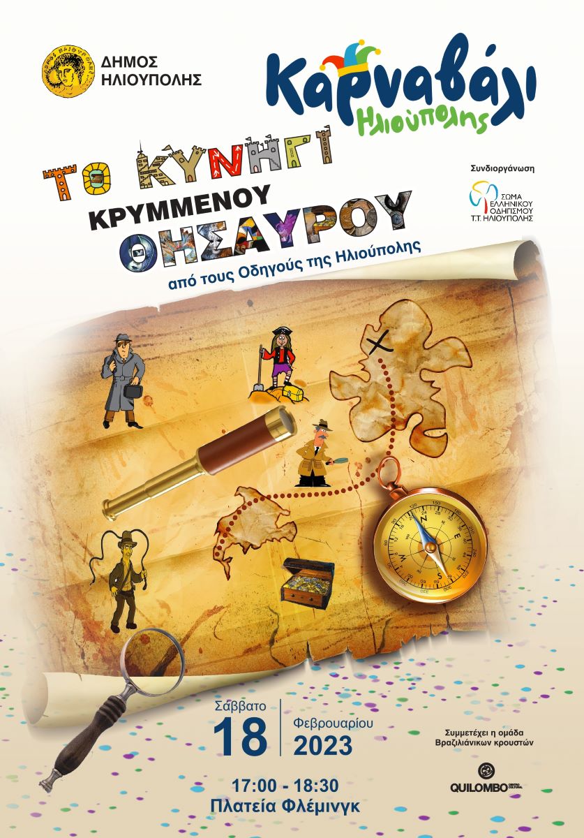 Το Σάββατο 18 Φεβρουαρίου 2023 και ώρα 17:00-18:30 στην πλατεία Φλέμινγκ σε συνεργασία με το Σώμα Οδηγισμού Τ.Τ. Ηλιούπολης θα γίνει το «Κυνήγι Κρυμμένου Θησαυρού» στους δρόμους της Ηλιούπολης με αφετηρία και τερματικό προορισμό την Πλατεία Φλέμινγκ. Συμμετέχει η Ομάδα