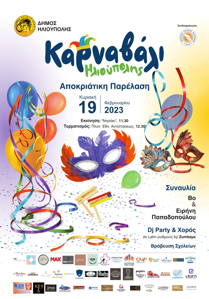 Την Κυριακή, 19 Φεβρουαρίου 2023 στις 11:30 π.μ. ο Δήμος Ηλιούπολης σε συνεργασία με τον Εμπορικό Σύλλογο Ηλιούπολης και τον Πρόεδρό του κ. Θανάση Μπίρλη διοργανώνει μεγάλη καρναβαλική παρέλαση, με τη συμμετοχή των Σχολείων, Συλλόγων Γονέων & Κηδεμόνων, Πολιτιστικών Συλλόγων, Φορέων, Σωματείων και πολιτών, στέλνοντας μηνύματα αγάπης, χαράς και κεφιού.