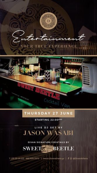 Την Πέμπτη (27/06) έχουμε ραντεβού για να απολαύσουμε τα coctails μας και να χορέψουμε πολύ. Ο νότιος dj Jason Wasabi θα βρείτε στα decks του Divan Athens για ένα άκρως καλοκαιρινό πάρτι με πολύ μουσική, κέφι και χορό.