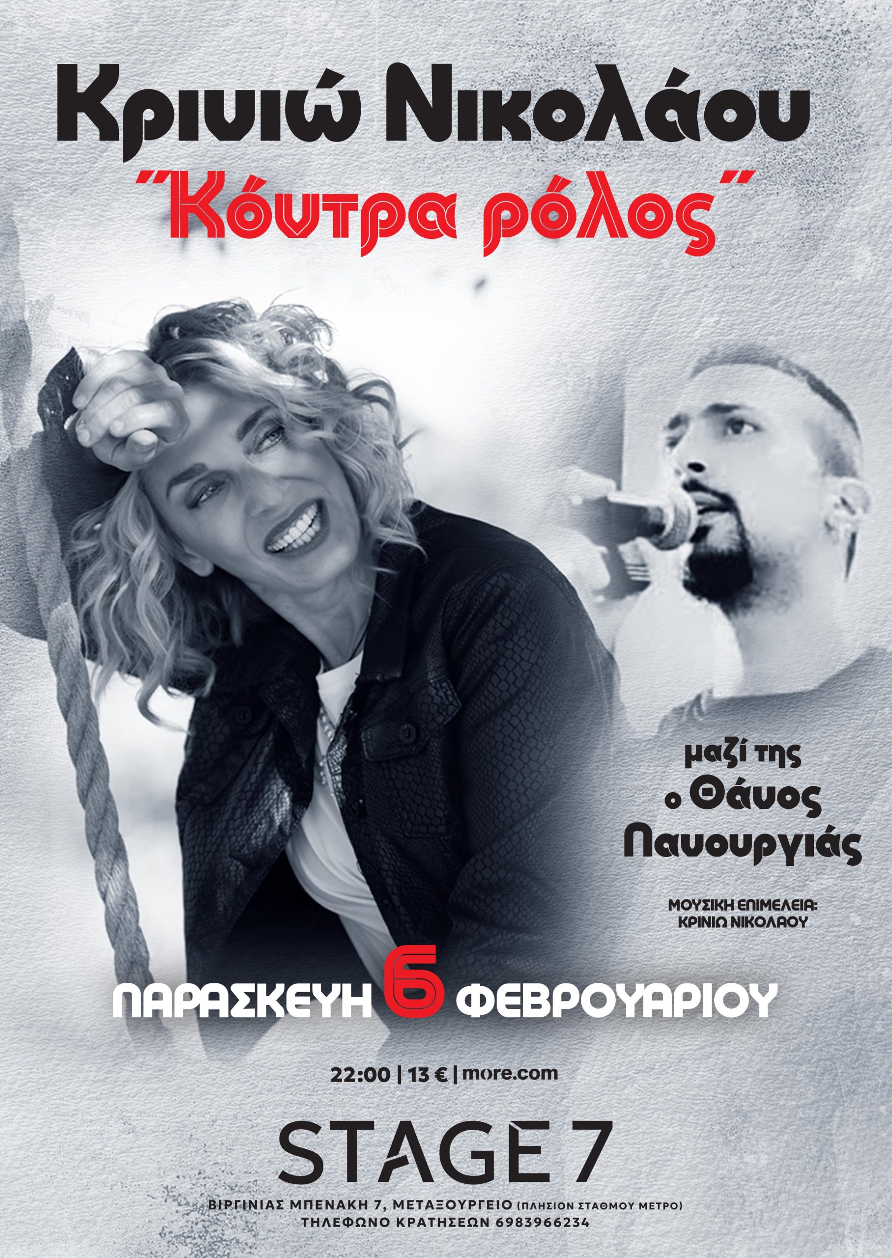 Η Κρινιώ Νικολάου παρουσιάζει στο Stage 7 τη μουσικοθεατρική παράσταση «Κόντρα ρόλος», ένα ταξίδι ανάμεσα στο παρελθόν και το παρόν, με χιούμορ, τρυφερότητα και ανατροπές. Μαζί της, ο Θάνος Πανουργιάς, σε έναν καλλιτεχνικό διάλογο που φέρνει διαφορετικές γενιές και αφηγήσεις στην ίδια σκηνή.