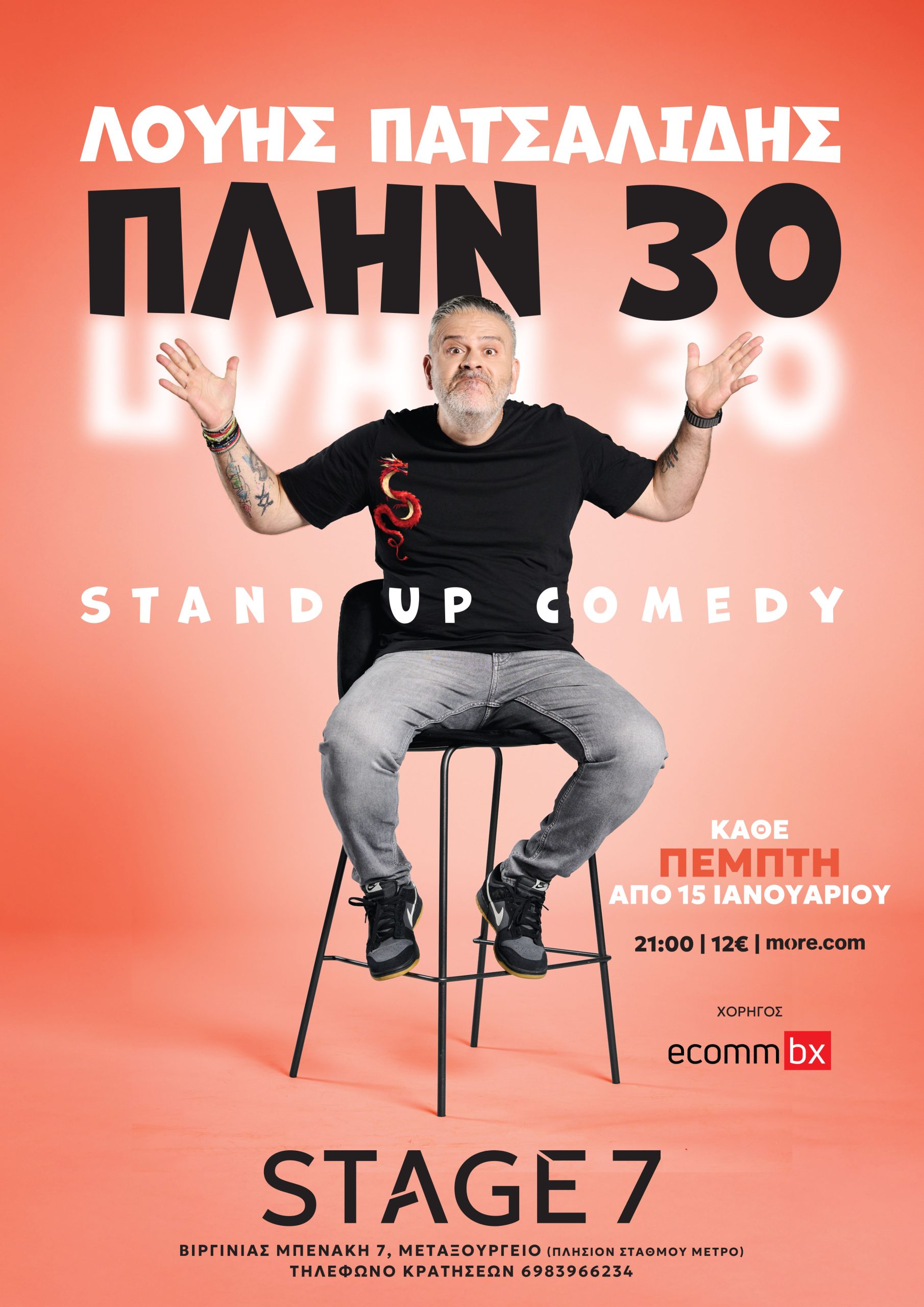 Ο Λούης Πατσαλίδης, ο πιο αναγνωρίσιμος stand-up comedian της Κύπρου, φέρνει στο Stage 7 την παράσταση «Πλην 30», μετατρέποντας τις Πέμπτες σε ένα σταθερό ραντεβού γέλιου.