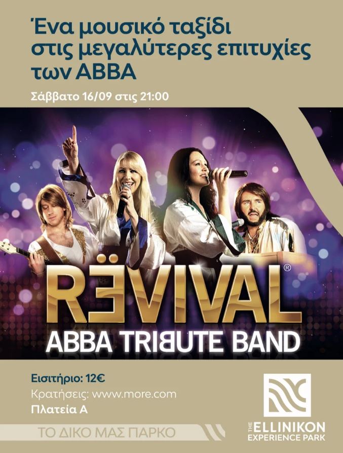 Σε μια βραδιά-γιορτή της pop μουσικής, η ABBA Revival Band έρχεται να ξεσηκώσει το κοινό, μέσα από ένα εντυπωσιακό show αφιερωμένο στα τραγούδια του θρυλικού συγκροτήματος, που άφησε εποχή και αγαπήθηκε από εκατομμύρια fans, επηρεάζοντας τους ήχους, την αισθητική κουλτούρα, τη μόδα και την παγκόσμια μουσική σκηνή.