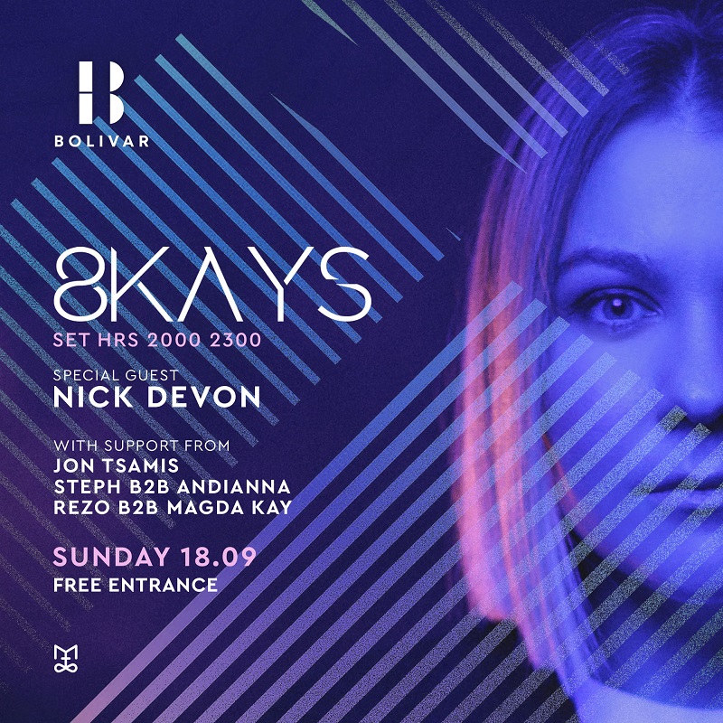 Την Κυριακή 18 Σεπτεμβρίου πάλι, τα sunset events επιστρέφουν στο Bolivar. Αυτή την Κυριακή καλεσμένη είναι η dj/producer 8Kays, με καταγωγή από το Κίεβο και releases σε εταιρείες όπως Renaissance Records, Blaufiield Music των Booka Shade, Anjunabeats των Above & Beyond, Eleatics Records και εμφανίσεις σε international festivals όπως τα Tomorrowland, Untold, Burning Man. Μαζί της ο καταξιωμένος Nick Devon και οι Jon Tsamis, Steph b2b Andianna, Rezo b2b Magda Kay.