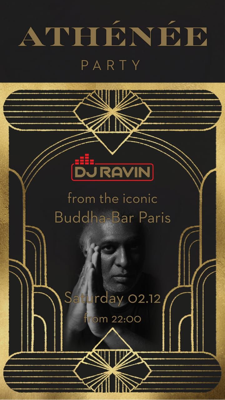Το Σάββατο 2 Δεκεμβρίου το Athénée υποδέχεται στα decks τον γνωστό DJ Ravin του Buddha Bar στο Παρίσι, ο οποίος αναμένεται να μας ταξιδέψει με τις μουσικές του επιλογές -έστω και νοητά- στη γαλλική πρωτεύουσα και στα κορυφαία μπαρ για τα οποία η πόλη φημίζεται.