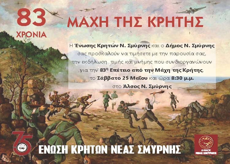 Τα 83 χρόνια από τη Μάχη της Κρήτης τιμά η Ένωση Κρητών Νέας Σμύρνης με μια εκδήλωση στο Άλσος το Σάββατο 25 Μαΐου στις 20.30.