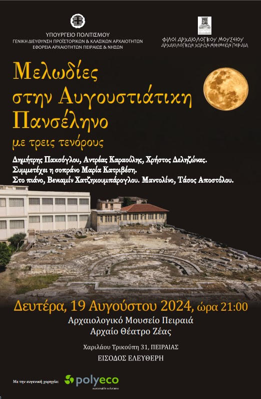 Η Εφορεία Αρχαιοτήτων Πειραιώς και Νήσων και ο Σύλλογος «Φίλοι Αρχαιολογικού Μουσείου Αρχαιολογικών Χώρων – Μνημείων Πειραιά», στο πλαίσιο των εκδηλώσεων της πανσελήνου του Αυγούστου, διοργανώνουν στον χώρο του Αρχαίου Θεάτρου της Ζέας -Αρχαιολογικό Μουσείο Πειραιά, τη Δευτέρα 19 Αυγούστου 2024 ώρα 21:00, μουσική εκδήλωση με τίτλο «Μελωδίες στην Αυγουστιάτικη Πανσέληνο με τρεις τενόρους».