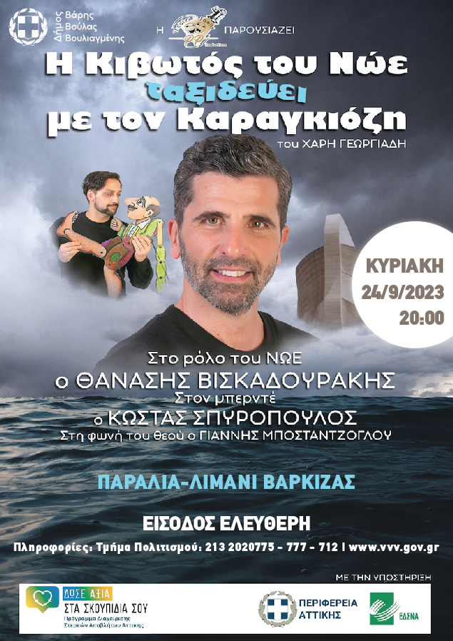 Μία θεατρική, διαδραστική, μουσική παράσταση για όλη την οικογένεια, με πρωταγωνιστές τον Θανάση Βισκαδουράκη στο ρόλο του Νώε και τον Καραγκιόζη της Oικογένειας Σπυρόπουλου στον μπερντέ, έρχεται την Κυριακή 24 Σεπτεμβρίου, ώρα 20:00μμ στην πλακόστρωτο – παραλία της Βάρκιζας. Πρόκειται για μια παιδική, θεατρική, διαδραστική, μουσική παράσταση 70 λεπτών όπου μέσα από το Θέατρο Σκιών, το θεατρικό παιχνίδι και τα μηνύματα του έργου, μαθαίνει στα παιδιά την αξία της ανακύκλωσης, της συνεργασίας και της αρμονικότητας.