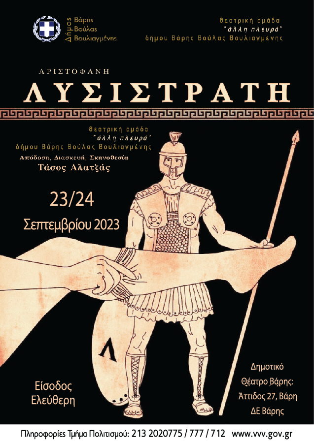 Η θεατρική ομάδα ‘’άλλη πλευρά’’ παρουσιάζει την «Λυσιστράτη» του Αριστοφάνη στις 23 και 24 Σεπτεμβρίου στις 21:00 στο Δημοτικό Θέατρο Βάρης, σε απόδοση, διασκευή και σκηνοθεσία του Τάσου Αλατζά.